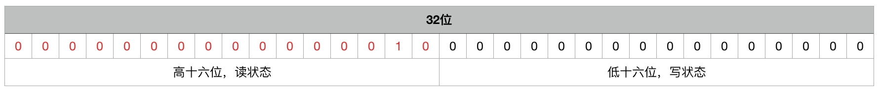 在独享锁中这个值通常是0或者1(如果是重入锁的话state值就是重入的次数),在共享锁中state就是持有锁的数量。但是在ReentrantReadWriteLock中有读、写两把锁,所以需要在一个整型变量state上分别描述读锁和写锁的数量(或者也可以叫状态)。于是将state变量“按位切割”切分成了两个部分,高16位表示读锁状态(读锁个数),低16位表示写锁状态(写锁个数)。如下图所示: