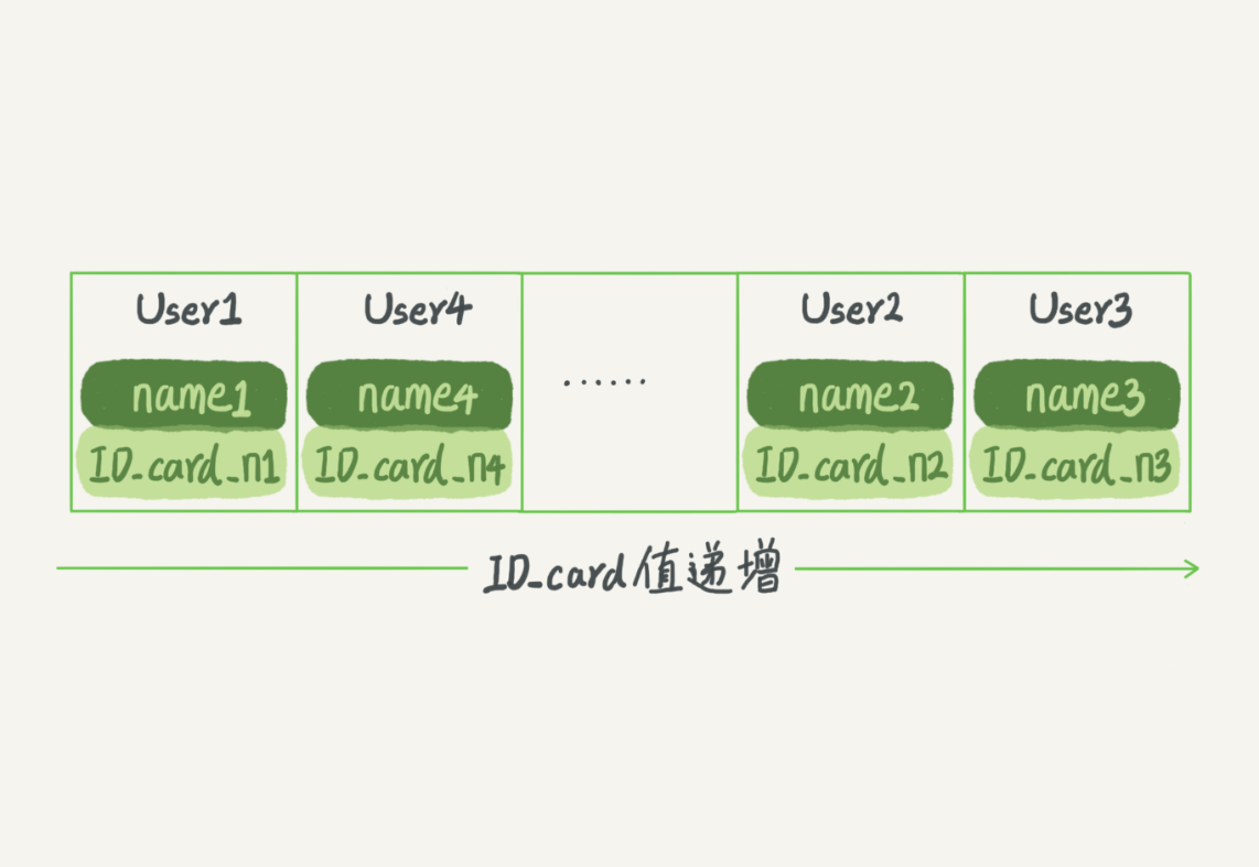 同时很显然,这个索引结构支持范围查询。你要查身份证号在[ID_card_X, ID_card_Y]区间的User,可以先用二分法找到ID_card_X(如果不存在ID_card_X,就找到大于ID_card_X的第一个User),然后向右遍历,直到查到第一个大于ID_card_Y的身份证号,退出循环。