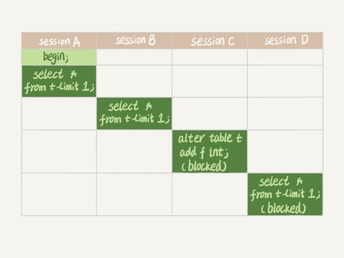之后session C会被blocked,是因为session A的MDL读锁还没有释放,而session C需要MDL写锁,因此只能被阻塞。