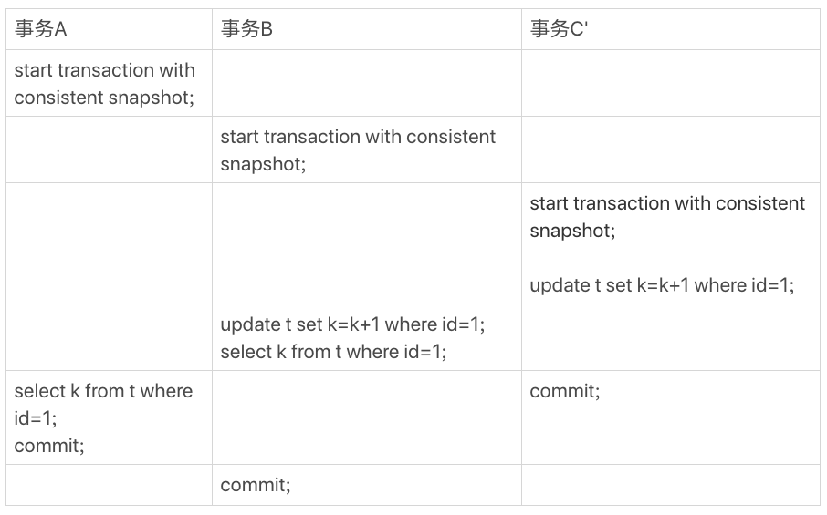 再往前一步,假设事务C不是马上提交的,而是变成了下面的事务C’,会怎么样呢?