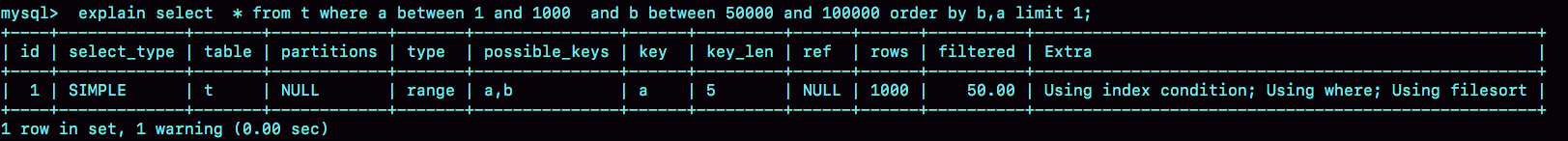 当然,这种修改并不是通用的优化手段,只是刚好在这个语句里面有limit 1,因此如果有满足条件的记录, order by b limit 1和order by b,a limit 1 都会返回b是最小的那一行,逻辑上一致,才可以这么做。