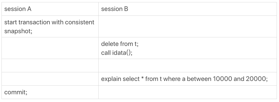 这里,session A的操作你已经很熟悉了,它就是开启了一个事务。随后,session B把数据都删除后,又调用了 idata这个存储过程,插入了10万行数据。