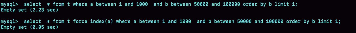 可以看到,原本语句需要执行2.23秒,而当你使用force index(a)的时候,只用了0.05秒,比优化器的选择快了40多倍。