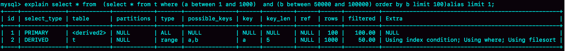 在这个例子里,我们用limit 100让优化器意识到,使用b索引代价是很高的。其实是我们根据数据特征诱导了一下优化器,也不具备通用性。