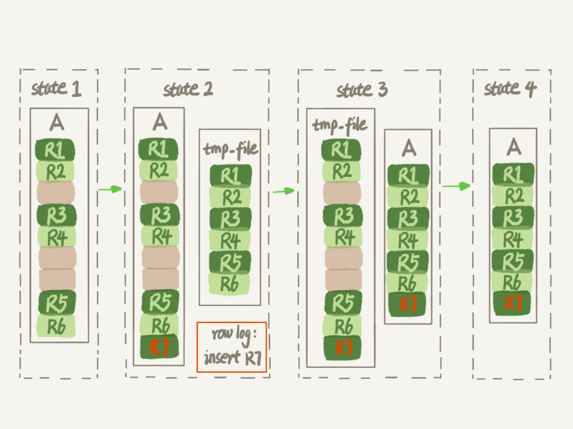 生成临时文件的过程中,将所有对A的操作记录在一个日志文件(row log)中,对应的是图中state2的状态;