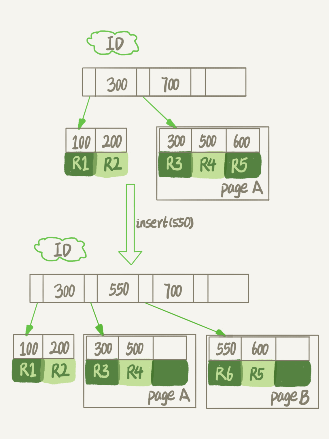假设图1中page A已经满了,这时我要再插入一行数据,会怎样呢?