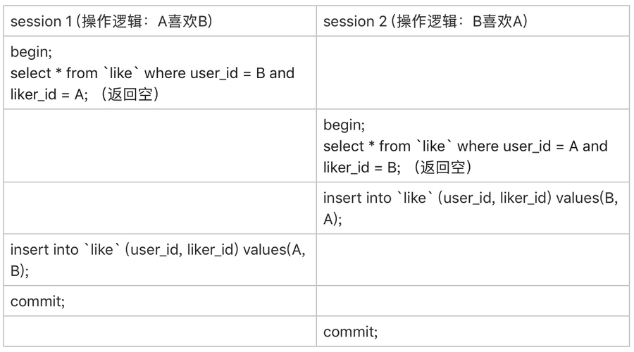commit;这个设计里,让“like”表里的数据保证user_id < liker_id,这样不论是A关注B,还是B关注A,在操作“like”表的时候,如果反向的关系已经存在,就会出现行锁冲突。
