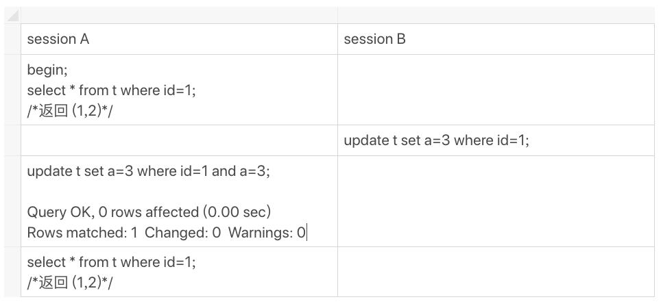 现在它返回的是(1,3),表示它看见了某个新的版本,这个版本只能是session A自己的update语句做更新的时候生成。(如果你对这个逻辑有疑惑的话,可以回顾下第8篇文章《事务到底是隔离的还是不隔离的?》中的相关内容)