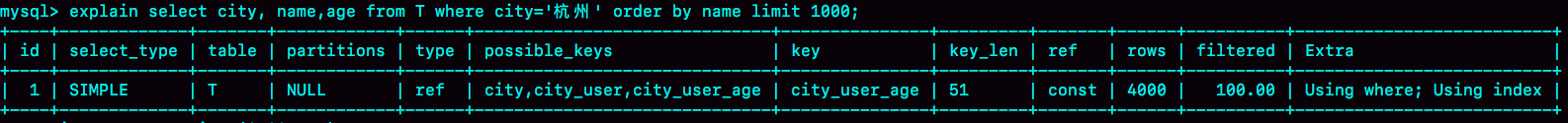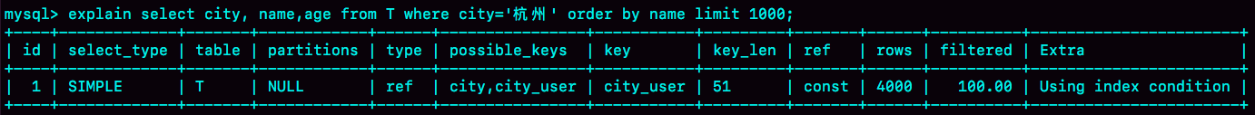 从图中可以看到,Extra字段中没有Using filesort了,也就是不需要排序了。而且由于(city,name)这个联合索引本身有序,所以这个查询也不用把4000行全都读一遍,只要找到满足条件的前1000条记录就可以退出了。也就是说,在我们这个例子里,只需要扫描1000次。