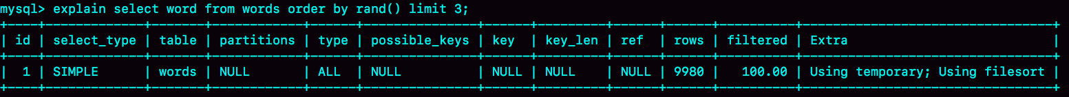 这个语句的意思很直白,随机排序取前3个。虽然这个SQL语句写法很简单,但执行流程却有点复杂的。
