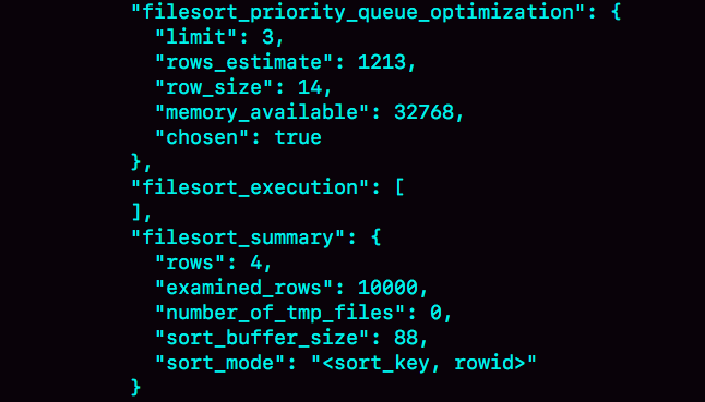这个SQL语句的排序确实没有用到临时文件,采用是MySQL 5.6版本引入的一个新的排序算法,即:优先队列排序算法。接下来,我们就看看为什么没有使用临时文件的算法,也就是归并排序算法,而是采用了优先队列排序算法。