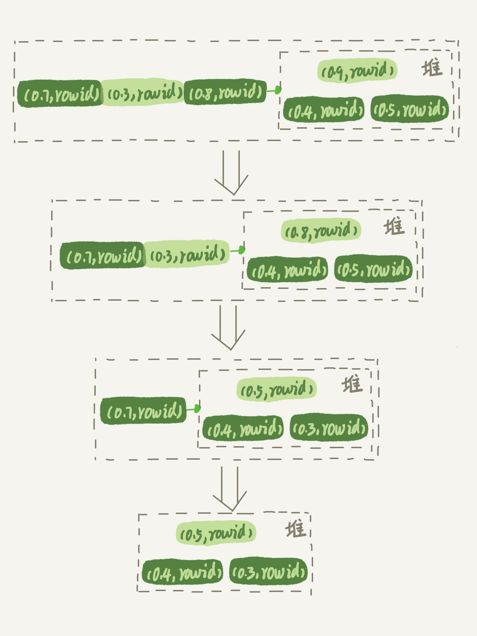 取下一个行(R’,rowid’),跟当前堆里面最大的R比较,如果R’小于R,把这个(R,rowid)从堆中去掉,换成(R’,rowid’);