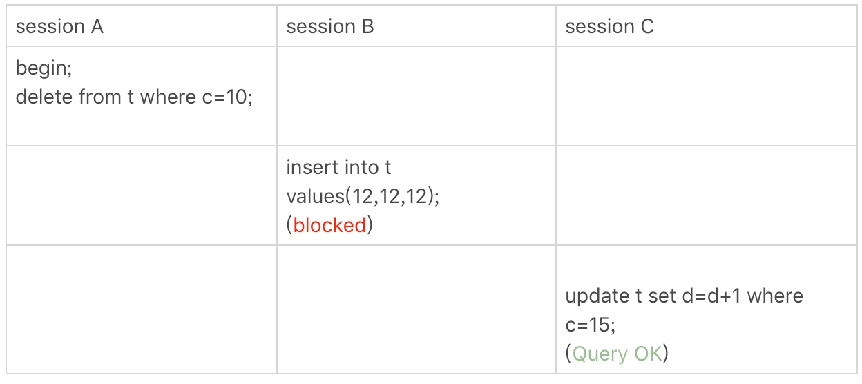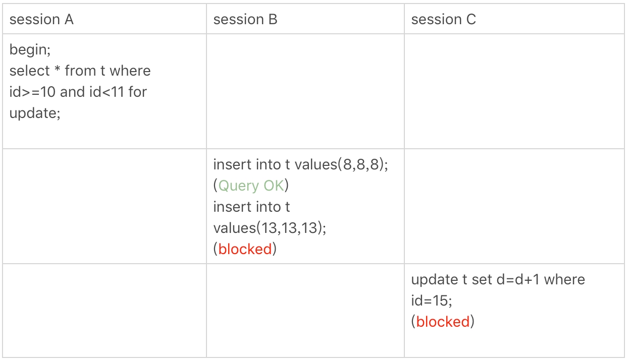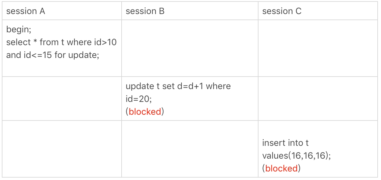 所以你看到了,session B要更新id=20这一行,是会被锁住的。同样地,session C要插入id=16的一行,也会被锁住。
