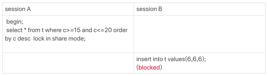 我把题目重新描述和简化一下:还是我们在文章开头初始化的表t,里面有6条记录,图12的语句序列中,为什么session B的insert操作,会被锁住呢?