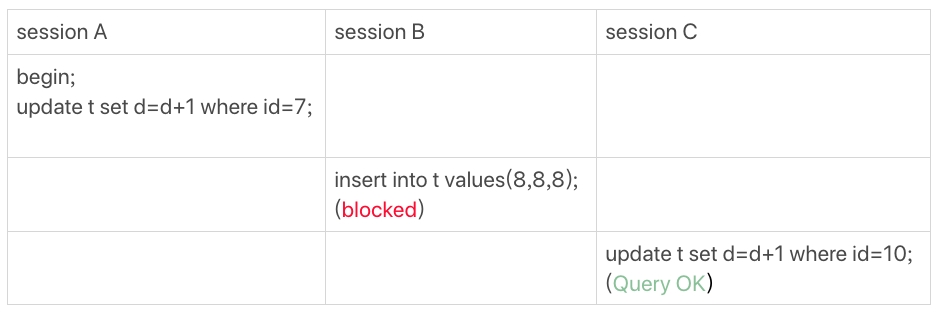 所以从结果上来看,sesson B要插入(8,8,8)的这个insert语句时就被堵住了。