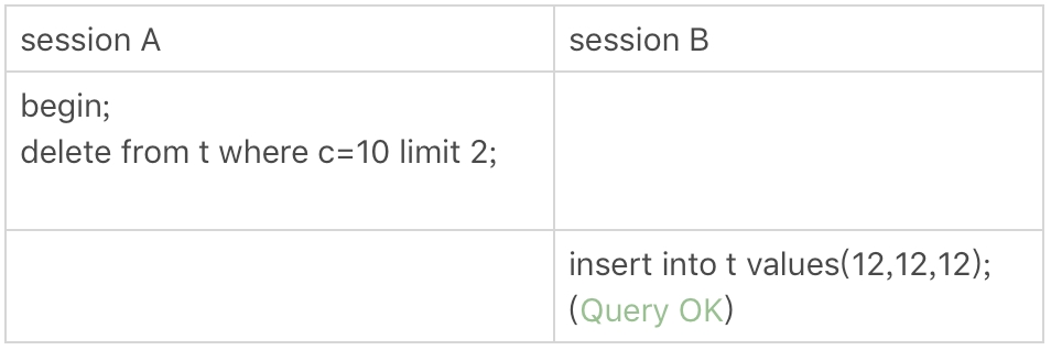 这个例子里,session A的delete语句加了 limit 2。你知道表t里c=10的记录其实只有两条,因此加不加limit 2,删除的效果都是一样的,但是加锁的效果却不同。可以看到,session B的insert语句执行通过了,跟案例六的结果不同。