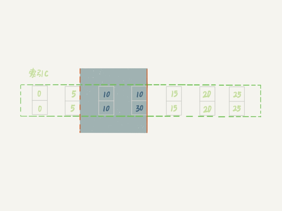 图中我画出了索引c上的主键id。为了跟间隙锁的开区间形式进行区别,我用(c=10,id=30)这样的形式,来表示索引上的一行。