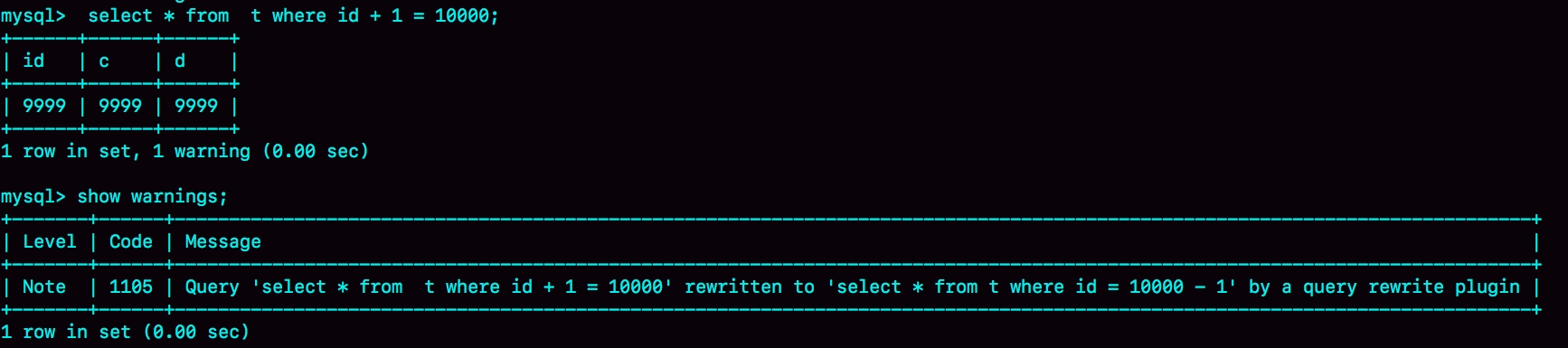 比如,语句被错误地写成了 select * from t where id + 1 = 10000,你可以通过下面的方式,增加一个语句改写规则。