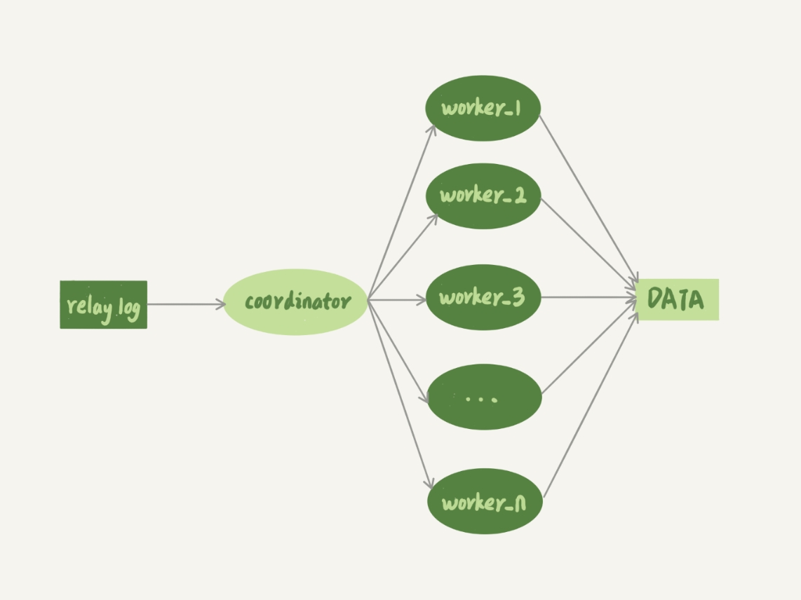 其实说到底,所有的多线程复制机制,都是要把图1中只有一个线程的sql_thread,拆成多个线程,也就是都符合下面的这个模型: