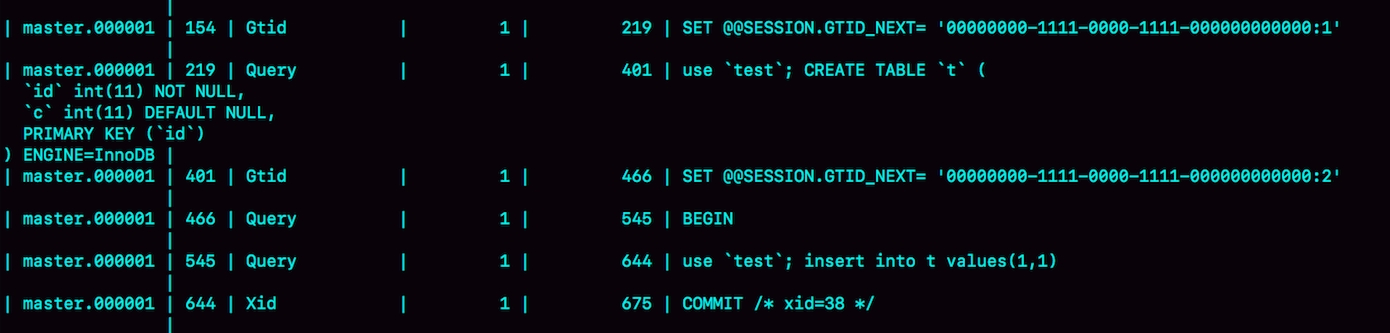 可以看到,事务的BEGIN之前有一条SET @@SESSION.GTID_NEXT命令。这时,如果实例X有从库,那么将CREATE TABLE和insert语句的binlog同步过去执行的话,执行事务之前就会先执行这两个SET命令, 这样被加入从库的GTID集合的,就是图中的这两个GTID。