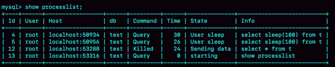 这时候,id=12这个线程的Commnad列显示的是Killed。也就是说,客户端虽然断开了连接,但实际上服务端上这条语句还在执行过程中。