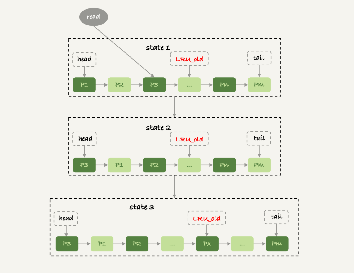 图7中状态1,要访问数据页P3,由于P3在young区域,因此和优化前的LRU算法一样,将其移到链表头部,变成状态2。