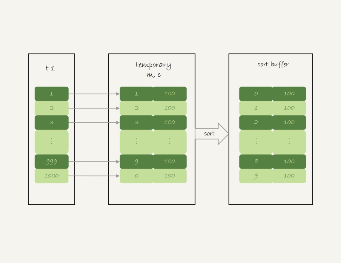 group by的语义逻辑,是统计不同的值出现的个数。但是,由于每一行的id%100的结果是无序的,所以我们就需要有一个临时表,来记录并统计结果。