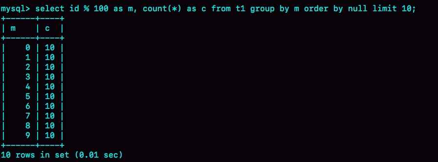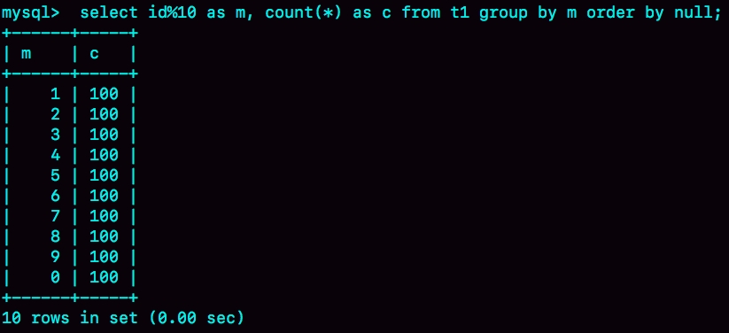 select id%10 as m, count(*) as c from t1 group by m order by null;这样就跳过了最后排序的阶段,直接从临时表中取数据返回。返回的结果如图8所示。