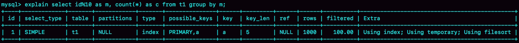 select id%10 as m, count(*) as c from t1 group by m;这个语句的逻辑是把表t1里的数据,按照 id%10 进行分组统计,并按照m的结果排序后输出。它的explain结果如下: