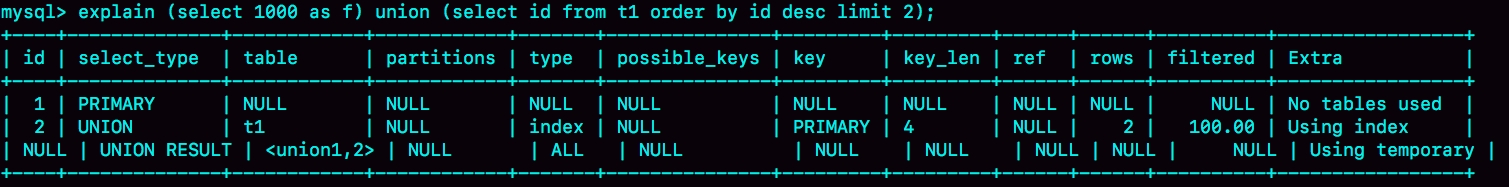 (select 1000 as f) union (select id from t1 order by id desc limit 2);这条语句用到了union,它的语义是,取这两个子查询结果的并集。并集的意思就是这两个集合加起来,重复的行只保留一行。