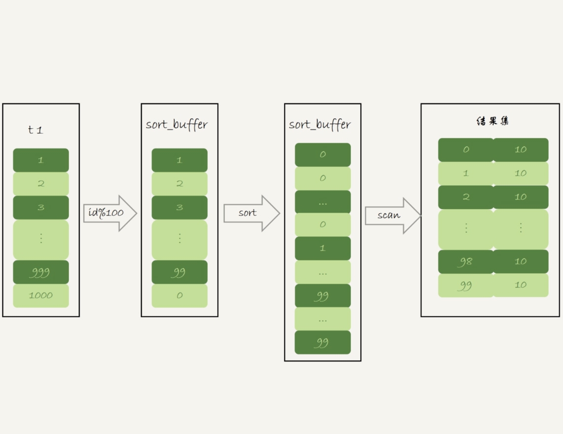 扫描表t1的索引a,依次取出里面的id值, 将 id%100的值存入sort_buffer中;