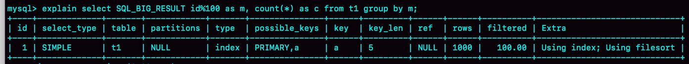 select SQL_BIG_RESULT id%100 as m, count(*) as c from t1 group by m;的执行流程就是这样的:
