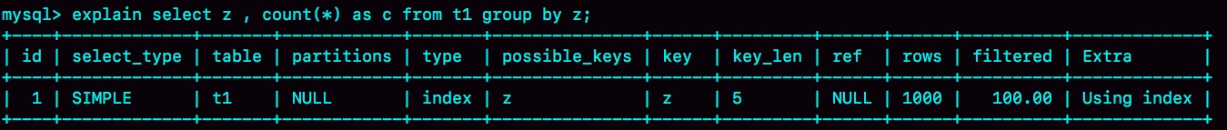 select z, count(*) as c from t1 group by z;优化后的group by语句的explain结果,如下图所示:
