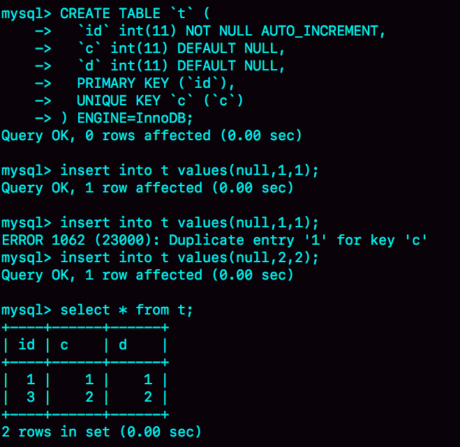 继续执行插入数据操作,由于已经存在c=1的记录,所以报Duplicate key error,语句返回。
