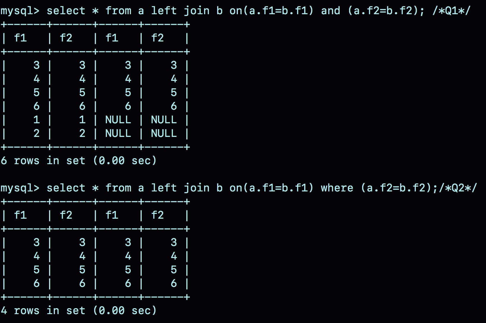 select * from a left join b on(a.f1=b.f1) where (a.f2=b.f2);/*Q2*/我把这两条语句分别记为Q1和Q2。