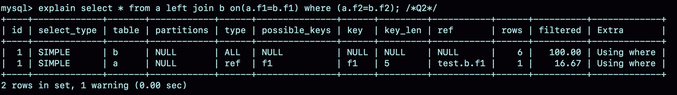 select * from a join b on(a.f1=b.f1) where (a.f2=b.f2);/*Q4*/我们再使用一次看explain 和 show warnings的方法,看看优化器是怎么做的。
